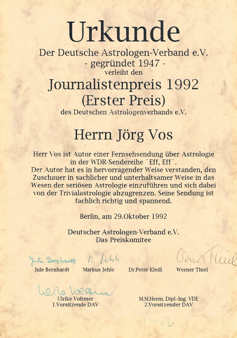 - 1. Journalistenpreis des Deutschen Astrologenverbandes für einen Film über die Gesetzmäßigkeiten eines Horoskops im Westdeutschen Fernsehen